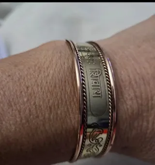 Pulsera de cobre con detalles en dorado y un grabado especial. - Diseño abierto yPulsera de 7 metales de cobre. Para la salud. Artrits, articulaciones y dolores musculares....etc. talladas a mano con el mantra universal del budismo. Traídas de los monasterios de Nepal. Únicas. Bendecidas. Protección ajustable. - Grabado de símbolos y texto. - Combinación de cobre y metal dorado.