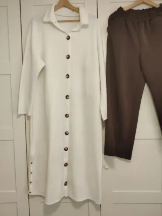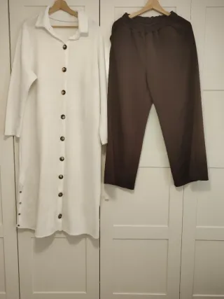Conjunto de dos prendas de ropa para mujer. - Cárdigan largo blanco con botones. - Pantalón marrón de cintura elástica.