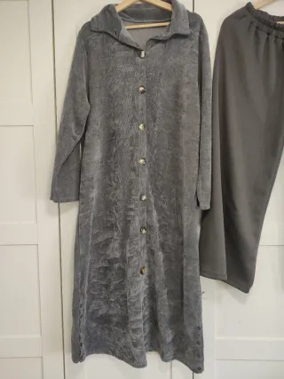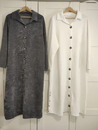 Conjunto de dos vestidos largos, uno en color gris y otro en blanco. Ambos son de talla única y presentan un diseño de botones. - Vestido gris de pana. - Vestido blanco de tejido texturizado. - Cierre de botones en la parte delantera.