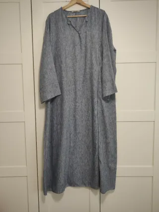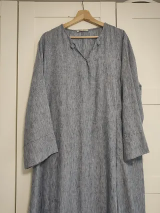 Vestido largo con un diseño texturizado en tonos azules y grises. Su corte es holgado y cómodo. - Manga larga. - Cuello en V con detalle de botones. - Abertura lateral en el bajo.