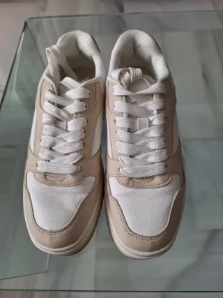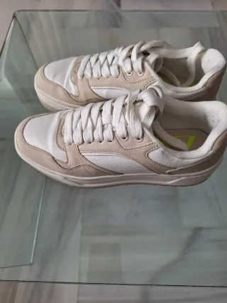 Zapatillas deportivas de Zara con un diseño moderno y versátil. - Combinación de colores beige y blanco. - Cierre con cordones. - Suela de goma.