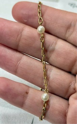 Delicada y juvenil pulsera artesanal elaborada en oro laminado de 18 quilates de altísima calidad, compuesta por resistentes eslabones que sostienen unas bonitas perlitas cultivadas que le aportan un toque elegante y fresco. Su diseño ligero y femenino la convierte en una pieza ideal tanto para uso diario como para ocasiones especiales. Cuenta con cierre de mosquetón, cómodo y seguro, y presenta los correspondientes sellos de autenticidad. Una pieza hecha a mano, con encanto artesanal; atemporal, perfecta para quienes buscan una joya delicada, juvenil y con personalidad. Entrega en mano en Valencia y envíos por Wallapop.