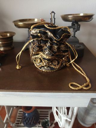 Elegante bolso de mano con un diseño intrincado. - Adornado con detalles dorados. - Cierre de cordón. - Acabado satinado.