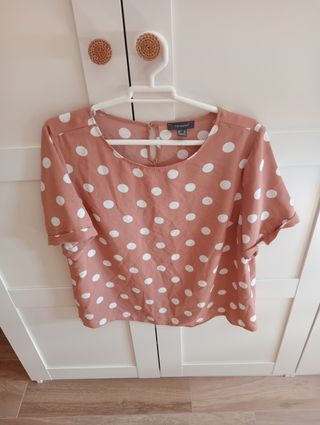 Blusa de mujer con un bonito estampado de lunares. - Diseño con cuello redondo. - Manga corta con vuelta. - Cierre de botón en la espalda.