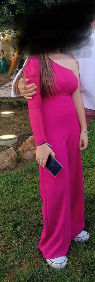 Mono de fiesta elegante y llamativo. - Diseño de un solo hombro. - Manga larga. - Pierna ancha.