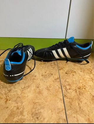 Botas de fútbol de piel en color negro con detalles en azul. - Marca Adidas. - Diseño con tres franjas blancas. - Cierre de cordones. - Nunca usadas - Sin caja debido a que la perdí