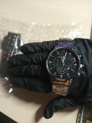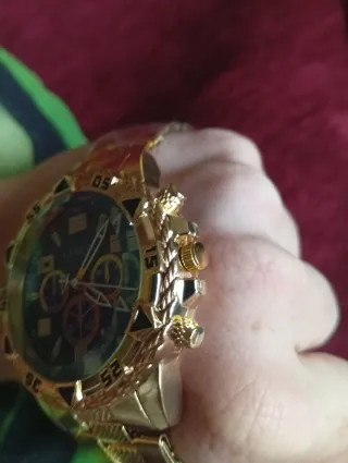 Elegante reloj GENEVA con detalles dorados y esfera negra. - Diseño moderno y llamativo. - Correa metálica dorada. - Esfera con múltiples subesferas. 🚚24/48 horas