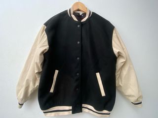 Chaqueta estilo bomber de H&M con un diseño clásico. Chaqueta / cazadora de béisbol bicolor. Modelo con cuello elevado de canalé, cierre con botones de presión. Oversize. Talla XS. - Cuerpo principal en color negro. - Mangas en color beige. - Cuello y puños con detalles de rayas.