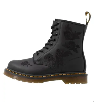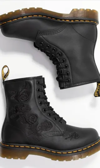 Botas Dr. Martens de cuero negro con un diseño floral bordado. - Detalle de rosas bordadas en el exterior. - Cordones negros. - Suela con costura amarilla característica.