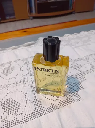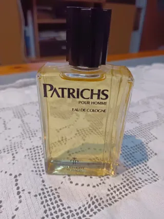 Colonia Patrichs Pour Homme Eau de Cologne. - Envase de cristal. - Líquido de color amarillo. - Tapón negro.