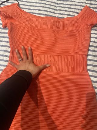 Vestido de la marca Guess en color naranja. Diseño moderno y favorecedor. - Escote Bardot. - Manga corta. - Tejido texturizado. - Corte ceñido.
