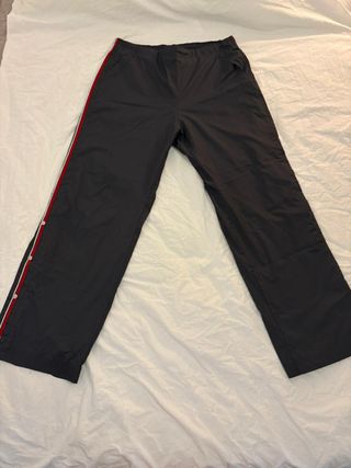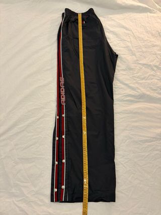 Pantalones deportivos Adidas con un diseño clásico y detalles distintivos. - Banda lateral roja y blanca. - Botones a presión en los laterales. - Cintura elástica.