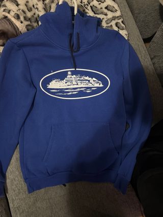 Chándal de color azul con un diseño gráfico en el pecho. - Estampado de una isla con edificios en el interior de un óvalo blanco. - Capucha con cordones negros. - Bolsillo frontal tipo canguro.