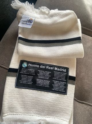 Bufanda oficial del Real Madrid con el escudo bordado y detalles de rayas. - Diseño tejido con el nombre del equipo. - Flecos en los extremos.