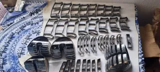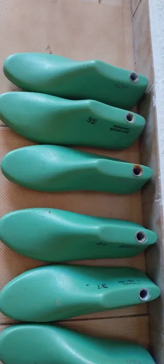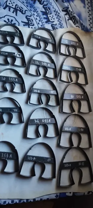 Lote de troqueles metálicos para la fabricación de calzado. Incluye una variedad de formas y tamaños. - Material: Metal. - Diseños variados para diferentes partes del zapato. - Marcados con números y letras para identificación.