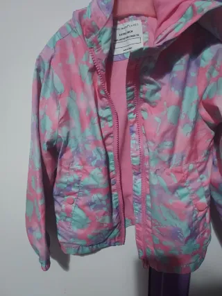 Chaqueta ligera con un diseño tie-dye en tonos rosas, morados y turquesas. - Cierre de cremallera. - Dos bolsillos delanteros con botón. - Capucha integrada.