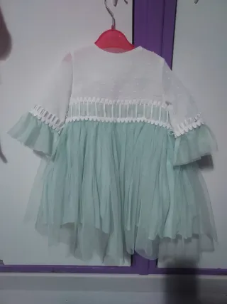 Vestido de fiesta con un diseño encantador. - Cuerpo superior blanco con detalles de lunares. - Fajín decorativo con pliegues blancos. - Falda vaporosa en tono verde menta. - Mangas acampanadas con volantes.