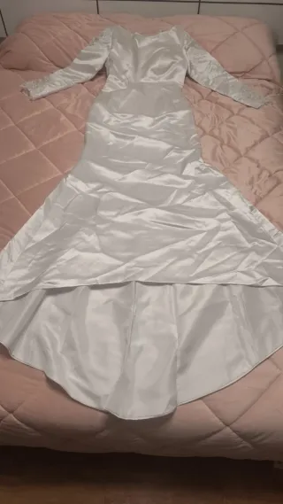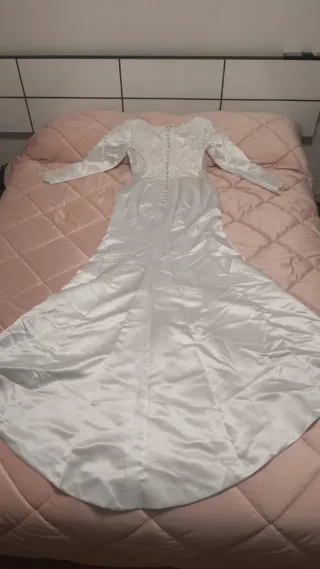 Elegante vestido de novia, nunca usado. - Diseño con manga larga. - Detalles de encaje en el corpiño y mangas. - Cierre de botones en la parte trasera.