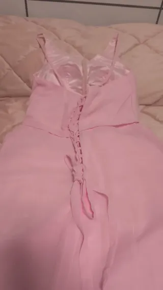 Vestido de fiesta elegante en tono rosa. - Diseño con escote pronunciado. - Cintura marcada. - Falda con caída fluida.