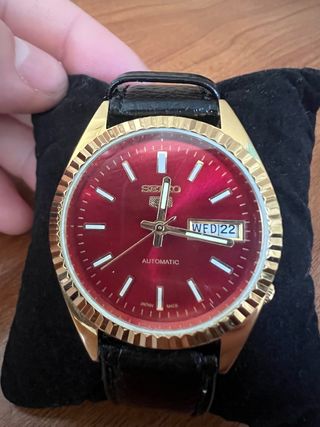 Reloj Seiko 5 automático con una llamativa esfera roja y detalles dorados. - Correa de piel negra. - Bisel estriado dorado. - Ventana de día y fecha.