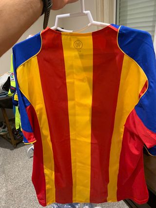 Camiseta de fútbol vintage del Valencia CF, modelo Senyera. - Diseño clásico con los colores del club. - Logo de Nike bordado. - Cuello redondo y mangas largas.