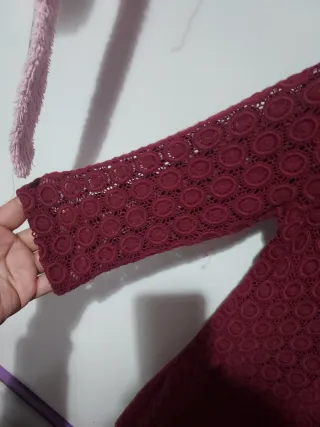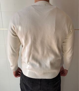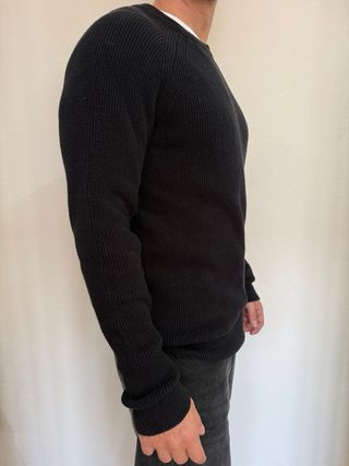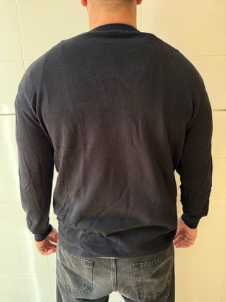 Jersey de punto fino con cuello alto. - Manga larga. - Tacto suave. - Es una S , pero yo uso M o L y me está largo, ósea que no se corresponde con la S. - Tiene dos zonas con unas cuantas bolitas como se ve en la foto número 4