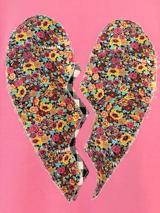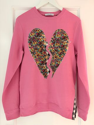 Sudadera artesanal de manga larga con un diseño único de corazón roto. - Corazón central con aplique de tela floral y cuadros. - Detalle de tela de cuadros en los laterales inferiores. - Cuello redondo y puños elásticos.
