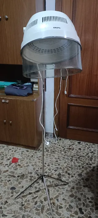 Secador de pie tipo casco, ideal para usar en casa. Permite un secado cómodo y uniforme. - Diseño tipo casco. - Altura ajustable. - Base estable.