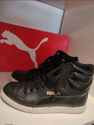 Zapatillas altas de la marca Puma en color negro. Diseño moderno y urbano. Niki modernos Pumas - Exterior de piel sintética brillante y mate. - Cierre con cordones. - Suela de goma blanca.