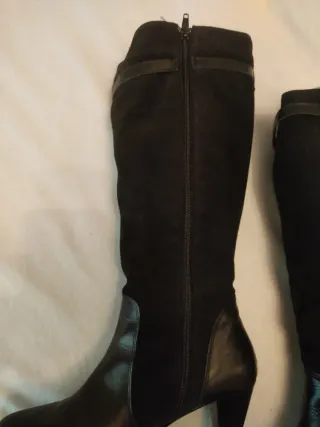 Botas altas de mujer en color negro. - Material exterior de ante y piel. - Tacón grueso. - Detalle de correa con hebilla en la parte superior.