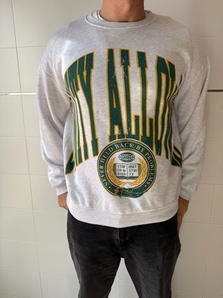 Sudadera de Pull&Bear con un diseño gráfico llamativo en la parte delantera. - Estampado central con letras y escudo. - Cuello redondo y manga larga.