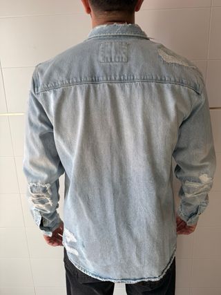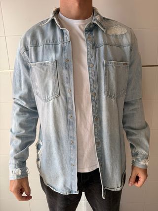 Sobrecamisa vaquera con un estilo moderno y desgastado. - Diseño con rotos y efecto desgastado. - Cierre de botones metálicos. - Dos bolsillos en la parte frontal.