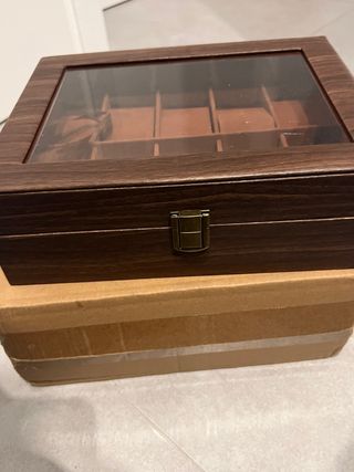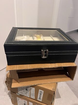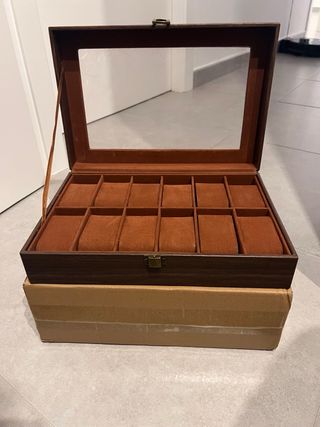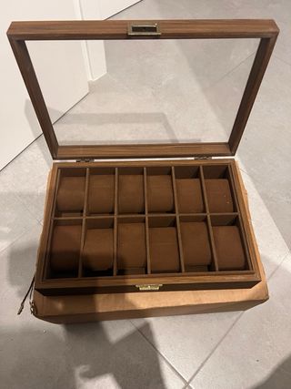 Elegante caja para guardar y exhibir hasta 12 relojes. - Diseño con tapa transparente. - Interior forrado en suave terciopelo. - Compartimentos individuales para cada reloj.