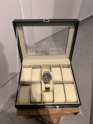 Elegante caja para guardar relojes. Tiene un diseño moderno y funcional. - Exterior en color negro. - Interior con compartimentos acolchados. - Tapa con ventana transparente. - Cierre metálico. - No incluye el reloj, si lo quieres 10€ mas