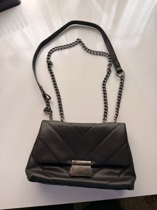 Elegante bolso negro con un diseño acolchado y detalles de cadena. - Acolchado con patrón chevron. - Cierre metálico plateado. - Correa de cadena y piel.