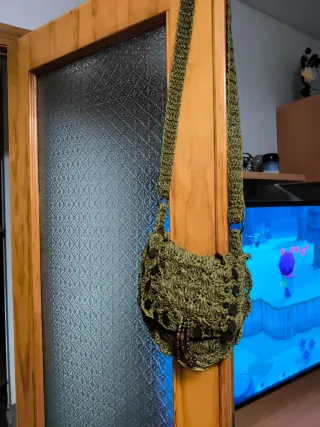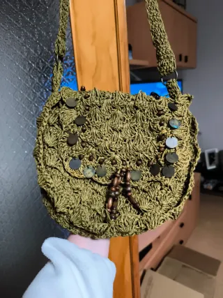 Bolso de mano tejido con un diseño bohemio y detalles de cuentas. - Estilo boho. - Cierre con solapa. - Adornado con cuentas oscuras. - Incluye borlas decorativas.