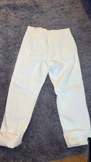 Pantalón vaquero de corte recto en color blanco de la marca Mango. Talla 34 pero equivale a 36 - Cintura alta. - Cierre de cremallera y botón. - Bolsillos delanteros y traseros. - Dobladillo deshilachado.