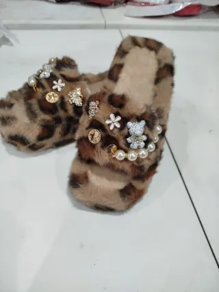 Adorables zapatillas de estar por casa con un diseño animal print y detalles brillantes. -ME QUEDAN POCAS PREGUNTAR POR VUESTRO NUMERO. - Acabado de pelo sintético suave. - Decoradas con perlas, pedrería y abalorios. - Estilo divertido y llamativo.