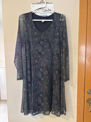 Vestido de manga larga con un estampado paisley multicolor sobre fondo azul oscuro. - Diseño con cuello en V. - Tejido ligero y vaporoso. - Largo hasta la rodilla.