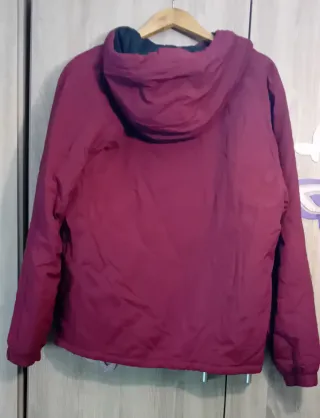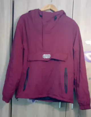 Abrigo con capucha de color morado. - Bolsillo frontal grande. - Cremallera parcial en el cuello. - Puños elásticos. - Cordones ajustables en la capucha y el bajo.
