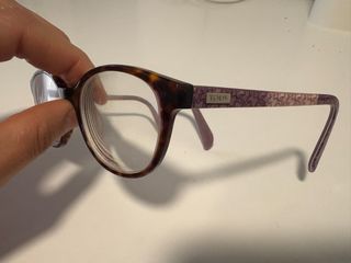 Gafas de vista de la marca Tous con un diseño moderno. - Montura con estampado de tortuga. - Varillas con diseño de ositos Tous. - Color marrón y morado.