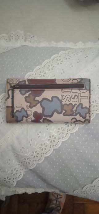 Famosa billetera de policloruro de vinilo y piel con estampado clásico de Tous. Doble compartimento con cierre botón a presión. Enganches interiores para "asa" (y vestir la carteta a modo "bolsito"). Forro de algodón en color turquesa. Modelo poco visto.Se entrega con funda y caja de la marca.No conservo certificado. Estado-A pesar de los años está casi cómo nueva y huele a nueva.Dos pequeñas manchas interiores (en el costado de la zona monedero) y zona del tirador con algo de desgaste. Ideal para amantes de la marca ya que está en un estado casi como nuevo. PRECIO NO NEGOCIABLE; NO rebajo ni respondo a ofertas y mucho menos absurdas.