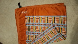 Manta con un diseño vibrante y llamativo. - Manta con reverso naranja. - Diseño frontal multicolor con patrones geométricos. - Etiqueta de la marca Tous. Buen estado