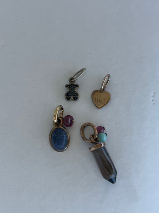 Conjunto de cuatro charms de la marca Tous. - Charm con forma de oso. - Charm con forma de corazón. - Charm con piedra ovalada azul. - Charm con piedra facetada y cuentas de colores.