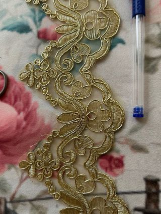 Precioso y muy original encaje dorado con un ancho de 10 cm. Para hacer la cenefa del traje de fallera, baturra, huertana, castellonense, alicantina, cualquier ocasión especial, cortinas, tapicería en general... consta de una pieza de 358 cm + otra de 64 cm + otra de 25 cm en total son 458 cm ( 4 metros y medio ) - Color dorado, fondo tul #cortinas #cenefa #randa #fallera #dançaes #tapiceria