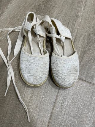 Zapatos marca Vul-peques de esparto con diseño de encaje crema y cintas para atar. - Material exterior de encaje. - Suela de goma y esparto muy flexible. Se pueden usar para trajes regionales como huertana, fallera, baturra... De niña, talla 27. Muy cómodas. Solo usadas una ofrenda. Hago descuento por lotes y envíos por la app.