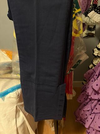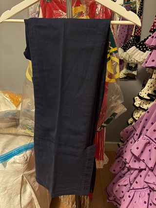 Pantalón de traje de corto campero en tono azul. Diseño clásico y elegante. Poco uso. - Tejido de calidad azul liso. - Detalle en el bajo para caireles. - Talla 38/40 M.