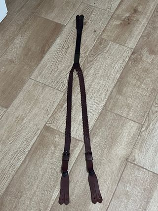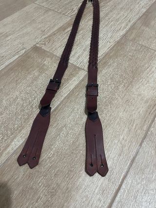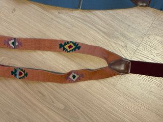 Tirantes de cuero para traje corto o pantalón campero. Son ajustables y tienen un diseño trenzado. - Material: Cuero - Diseño trenzado - Hebillas metálicas para ajuste - Puntas con flecos decorativos - forrados en su interior para no manchar la camisa