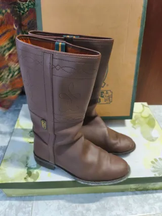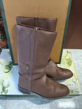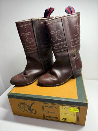 Botas camperas, altas, de cuero, en color marrón. Presentan un diseño clásico con detalles bordados. Perfectas para subir a caballo y complementar traje de gitano - Material: Cuero - Color: Marrón - Diseño: Bordados decorativos
