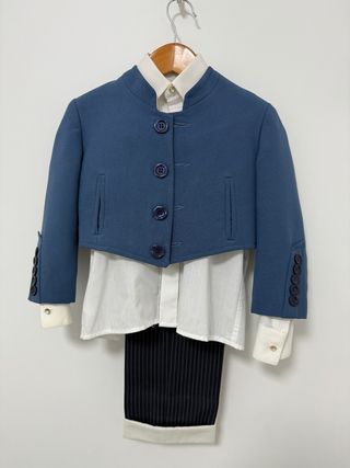 Conjunto de traje completo campero para niño de 4 años. Incluye chaqueta, camisa, pantalón y botas camperas. - Chaqueta azul con botones. - Camisa blanca. - Pantalón de raya diplomática. - Botas camperas nº 25.